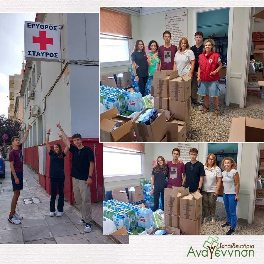 Μια αντιπροσωπία παιδιών της Γ Λυκείου παρέδωσε στους εθελοντές του Ελληνικού Ερυθρού Σταύρου παραρτήματος Πάτρας τρόφιμα και είδη προσωπικής υγιεινής, που είχαν συγκεντρωθεί από τους μαθητές όλων των βαθμίδων των Εκπαιδευτηρίων μας, για τους πλημμυροπαθείς συνανθρώπους μας στη Θεσσαλία.