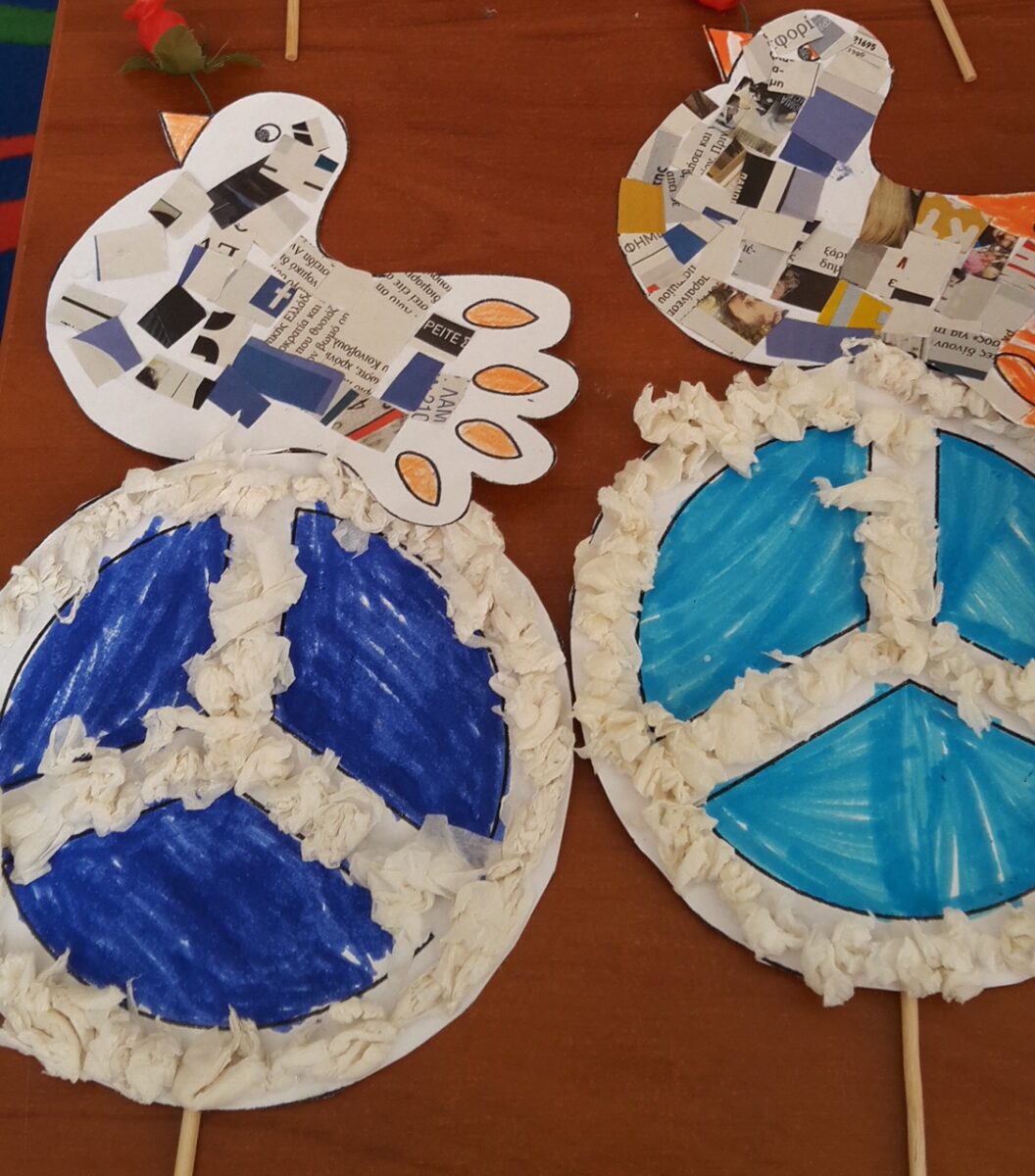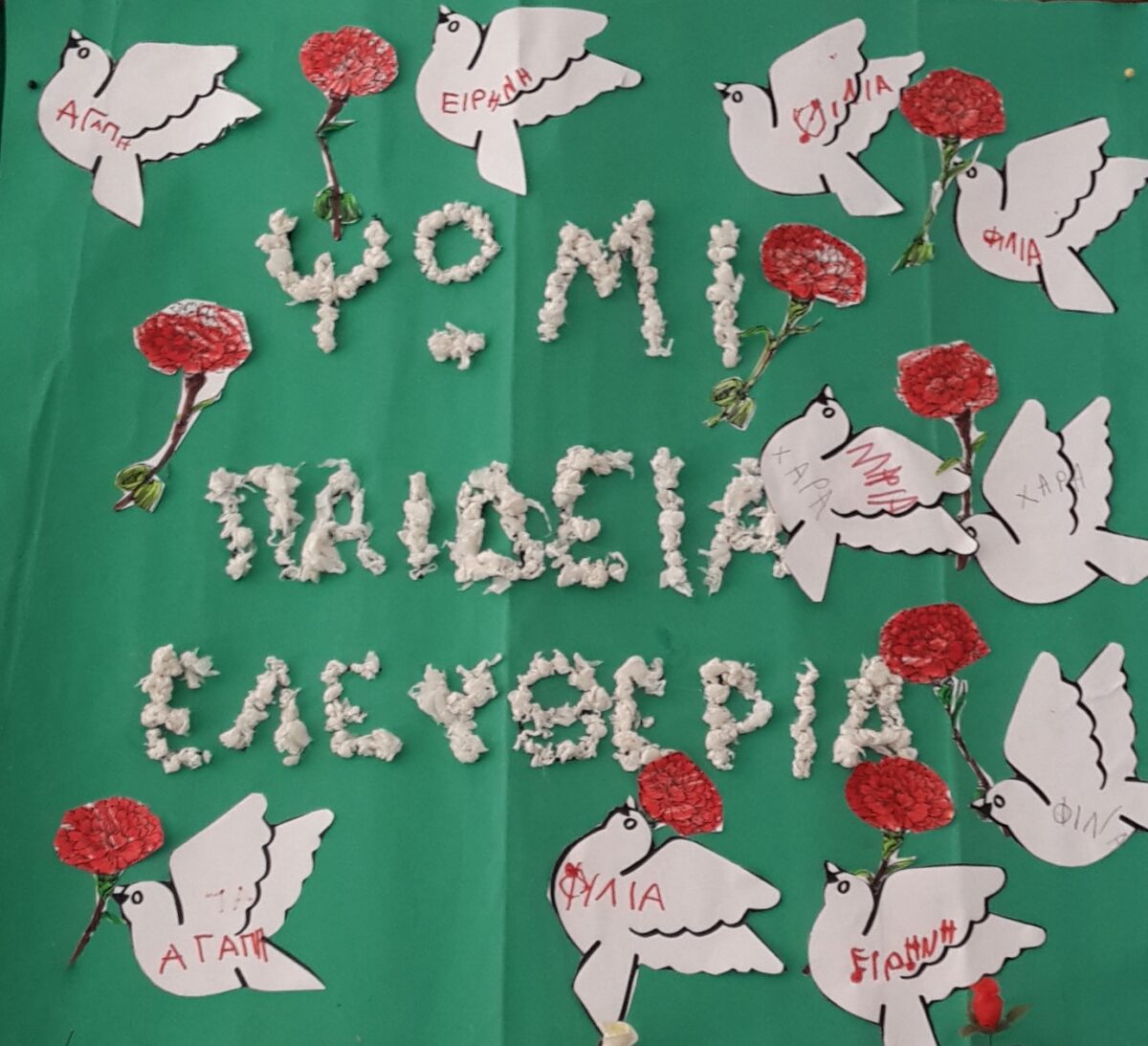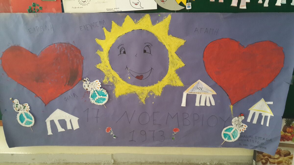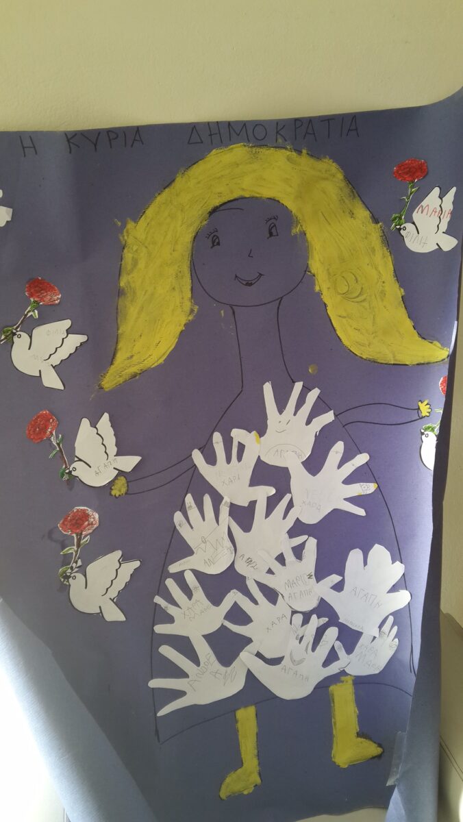 Τα Νηπιάκια μας ζωγραφίζουν στον τοίχο 2 καρδιές και έναν ήλιο στη μέση και τραγουδούν για την ελευθερία,την αγάπη και τη δημοκρατία! Στολίζουν την κυρία δημοκρατία με τα χεράκια τους στέλνοντας μήνυμα αγάπης, φιλίας και ειρήνης!