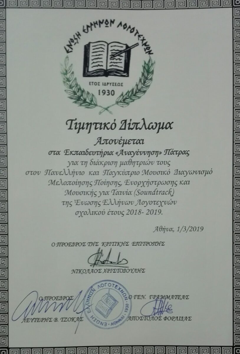 Α’ Έπαινος Μελοποίησης & Γ’ Έπαινος Ενορχήστρωσης