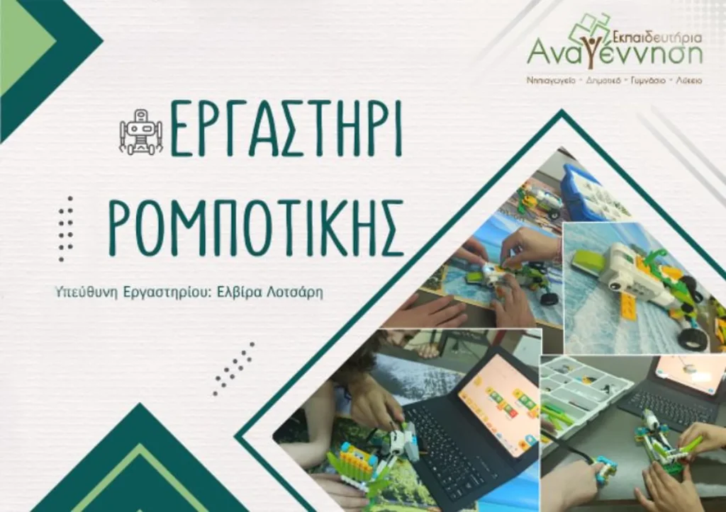 Η ρομποτική είναι η επιστήμη και η τεχνολογία των Ρομπότ, η οποία περιλαμβάνει τον σχεδιασμό, την κατασκευή και τον προγραμματισμό τους. Μέσα σε ένα ομαδοσυνεργατικό περιβάλλον μάθησης τα παιδιά αναλαμβάνουν ρόλους, ποιο συγκεκριμένα του μηχανικού και του προγραμματιστή, οι οποίοι εναλλάσσονται κάθε φορά, με στόχο το σχεδιασμό και την κατασκευή  ρομπότ που έχουν παρόμοια χαρακτηριστικά με τον άνθρωπο ή τα ζώα.