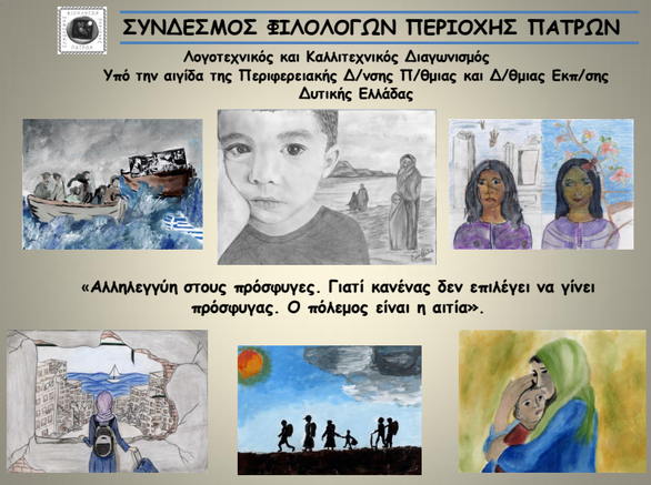Θερμά συγχαρητήρια στους μαθητές μας Γιακουμάκη Γεώργιο, μαθητή της Γ΄ Λυκείου και Γιακουμάκη Δήμητρα, μαθήτρια της Α΄Γυμνασίου, για τη διάκρισή τους στο λογοτεχνικόκαλλιτεχνικό διαγωνισμό του Συνδέσμου Φιλολόγων Περιοχής Πατρών, με θέμα τους πρόσφυγες κάθε εποχής και εθνικότητας. Οι μαθητές μας, για άλλη μια φορά, έδειξαν την ευαισθησία τους για τους ανθρώπους εκείνους που αναγκάστηκαν να εγκαταλείψουν τις εστίες τους, εξαιτίας του πολέμου, της σκληρότητας, του φανατισμού, της επεκτατικής πολιτικής κάποιων «ισχυρών».