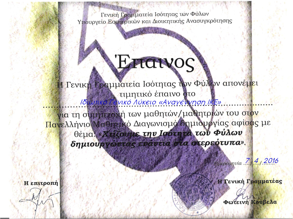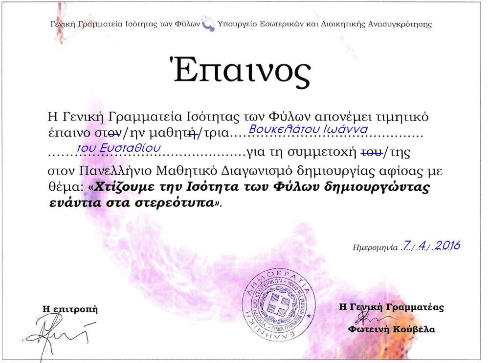 Η μαθήτρια του Λυκείου μας, Βουκελάτου Ιωάννα, παρέλαβε τιμητικό έπαινο από τη Γενική Γραμματεία Ισότητας των Φύλων για τη Συμμετοχή της στον Πανελλήνιο Διαγωνισμό Δημιουργίας αφίσας με θέμα: “Χτίζουμε την Ισότητα των Φύλων δημιουργώντας ενάντια στα στερεότυπα”!