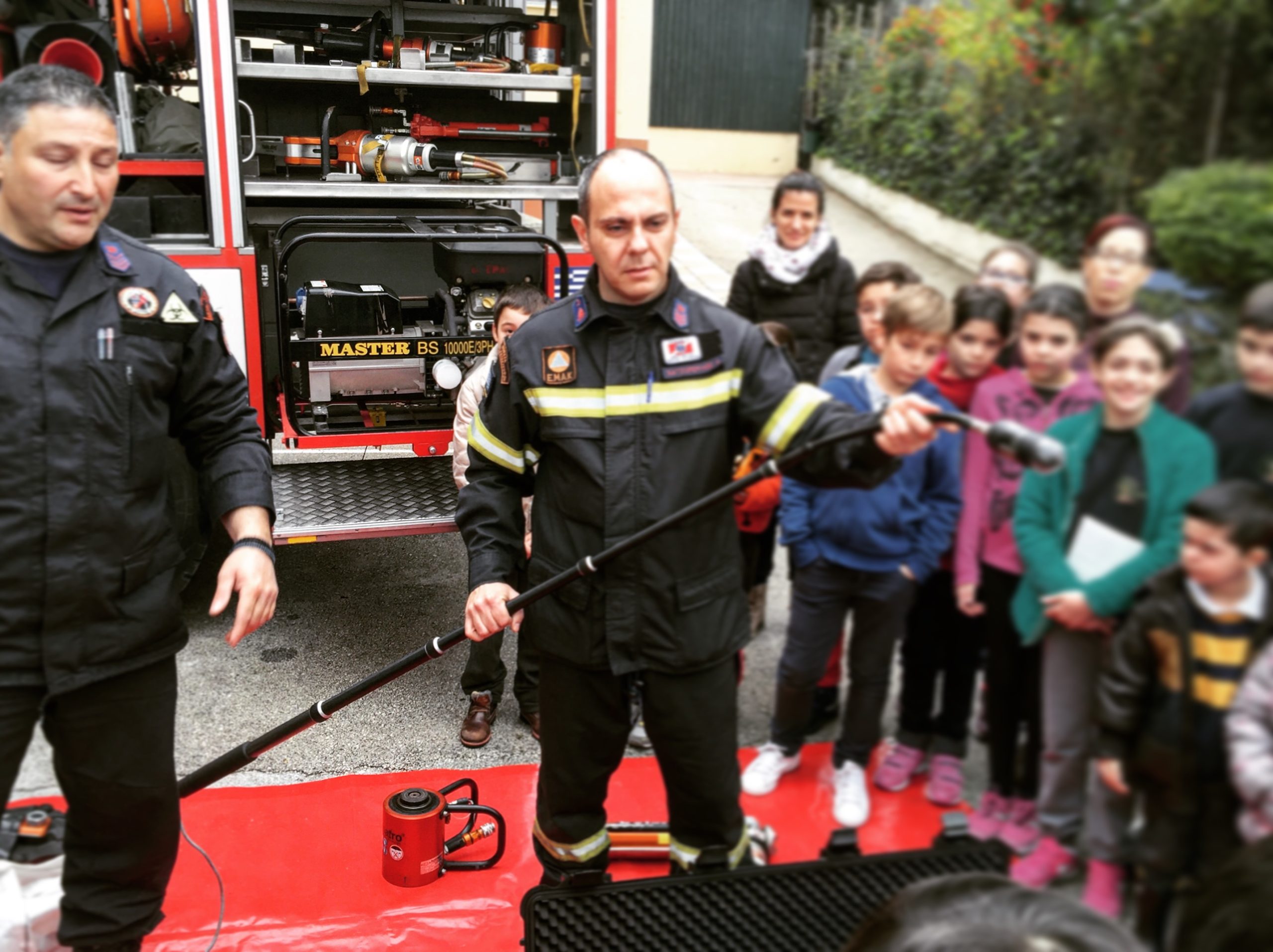 Στη συνέχεια βγήκαμε στο προαύλιο που είχε έρθει ένα από τα οχήματα της 6ης ΕΜΑΚ! Εκεί οι άνδρες της ΕΜΑΚ έδειξαν στους μαθητές αρκετά από τα σύνεργά τους και πώς τα χρησιμοποιούν στην αποστολές τους!